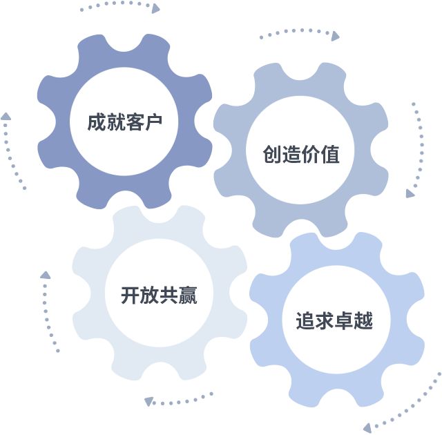 成就客户是一切决策的出发点,,创造价值是衡量所有工作的标准,,追求卓越是我们做事做人的态度,,,开放共赢是我们的格局也是最终的结果。。。价值观的齿轮环环相扣,,,,推动着组织里的每个人不断向前。。。。